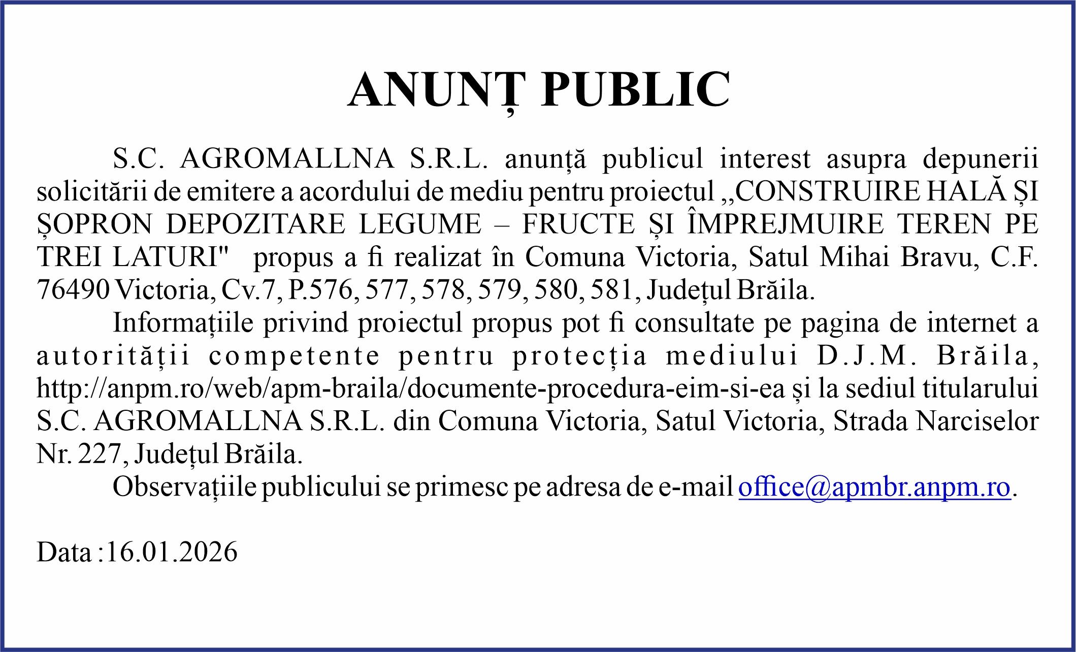 ANUNȚ PUBLIC solicitare de emitere a acordului de mediu pentru proiectul ,,CONSTRUIRE HALA ȘI ȘOPRON DEPOZITARE LEGUME – FRUCTE ȘI ÎMPREJMUIRE TEREN PE TREI LATURI" propus a fi realizat în Satul Mihai Bravu, Comuna Victoria, Județul Brăila