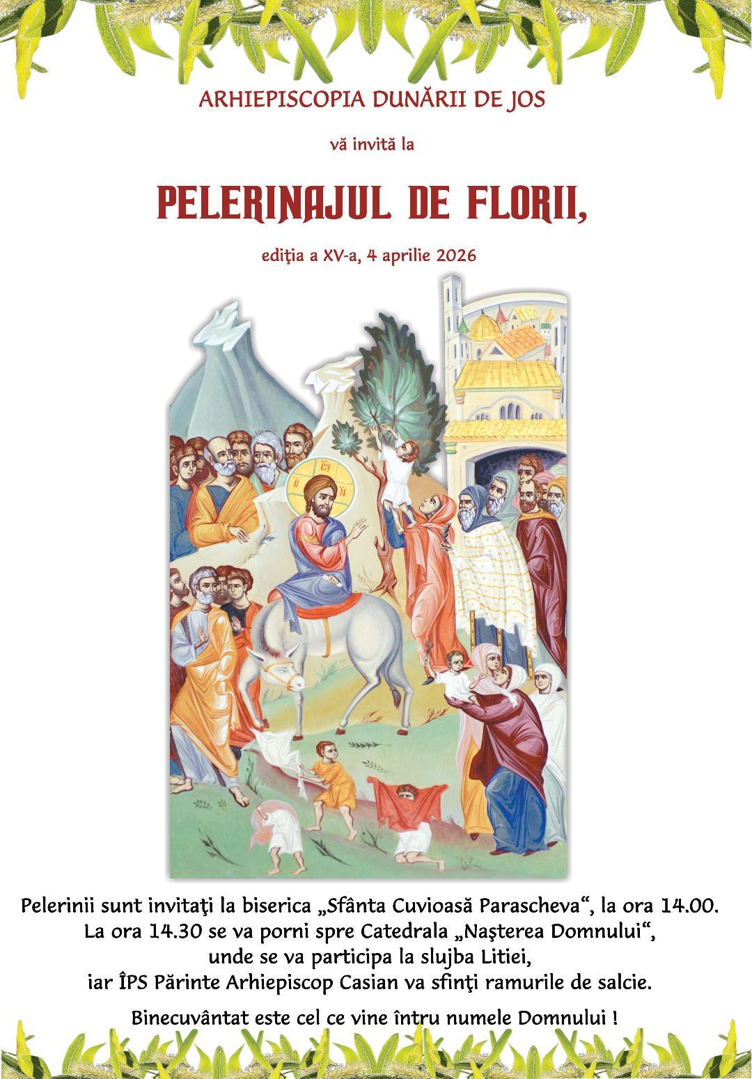 Sâmbătă, 4 aprilie 2026, în ajunul Praznicului împărătesc al Floriilor, în municipiile Galaţi şi Brăila, precum şi în alte localităţi din cele două judeţe ale Arhiepiscopiei Dunării de Jos se va desfăşura tradiţionalul Pelerinaj de Florii, care aminteşte de momentul Intrării Mântuitorului nostru Iisus Hristos în cetatea Ierusalimului.